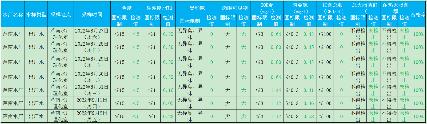 2022年8月27日-2022年9月2日出厂水水质检测结果