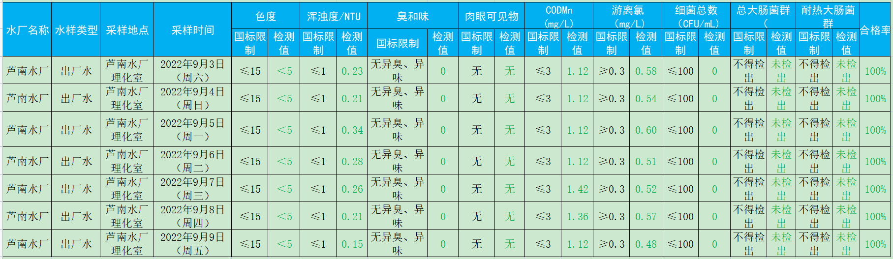 2022年9月3日-2022年9月9日出厂水水质检测结果