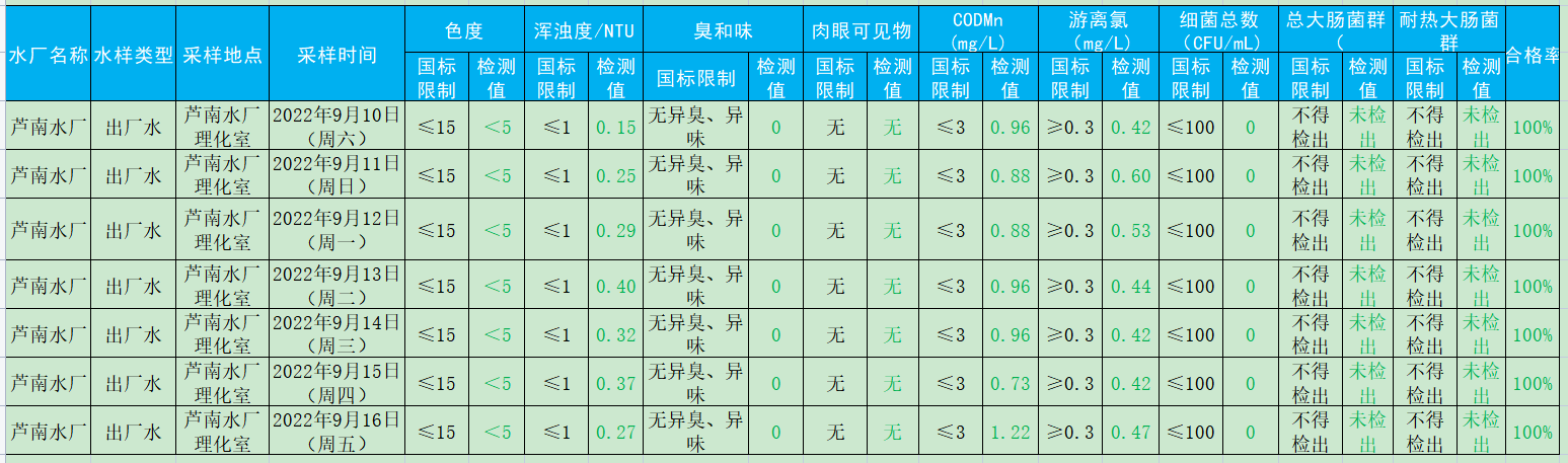 2022年9月10日-2022年9月16日出厂水水质检测结果