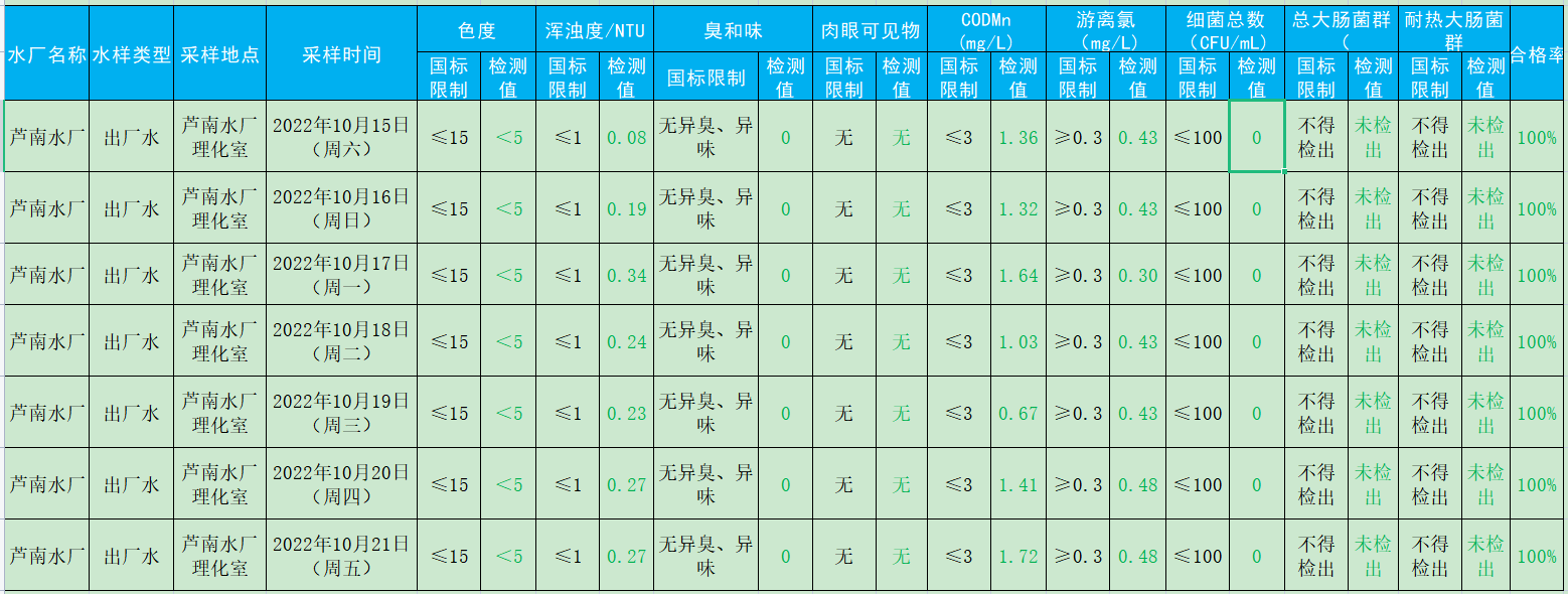 2022年10月15日-2022年10月21日出厂水水质检测结果