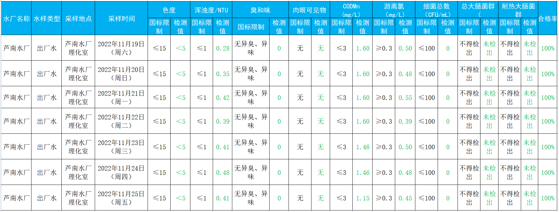 2022年11月19日——2022年11月25日出厂水水质检测结果