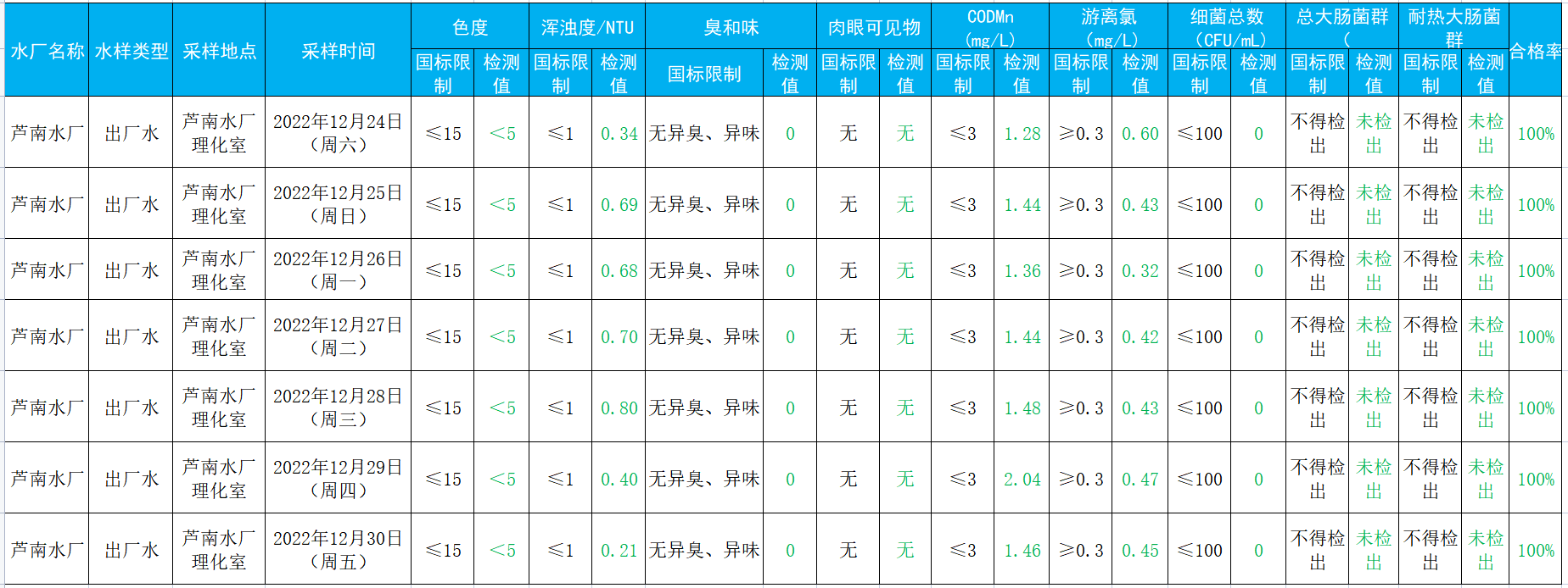 2022年12月24日——2022年12月30日出厂水水质检测结果