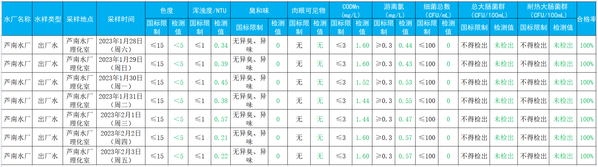 2023年1月28日——2023年2月3日出厂水水质检测结果