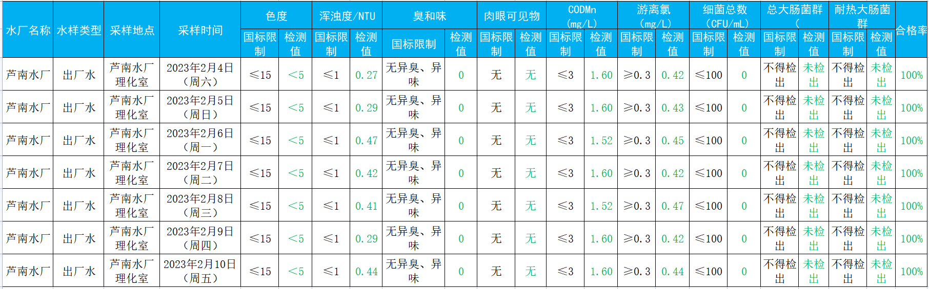 2023年2月4日——2023年2月10日出厂水水质检测结果