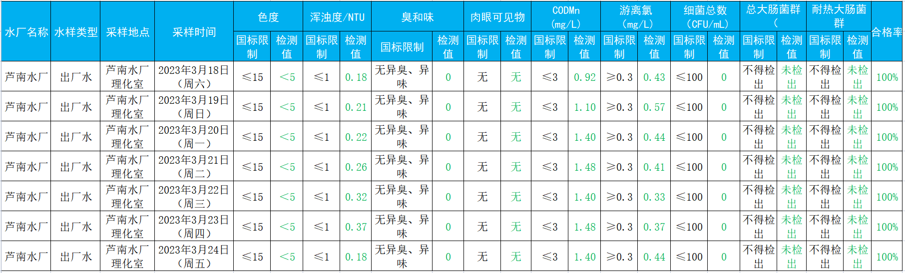 2023年3月18日——2023年3月24日出厂水水质检测结果