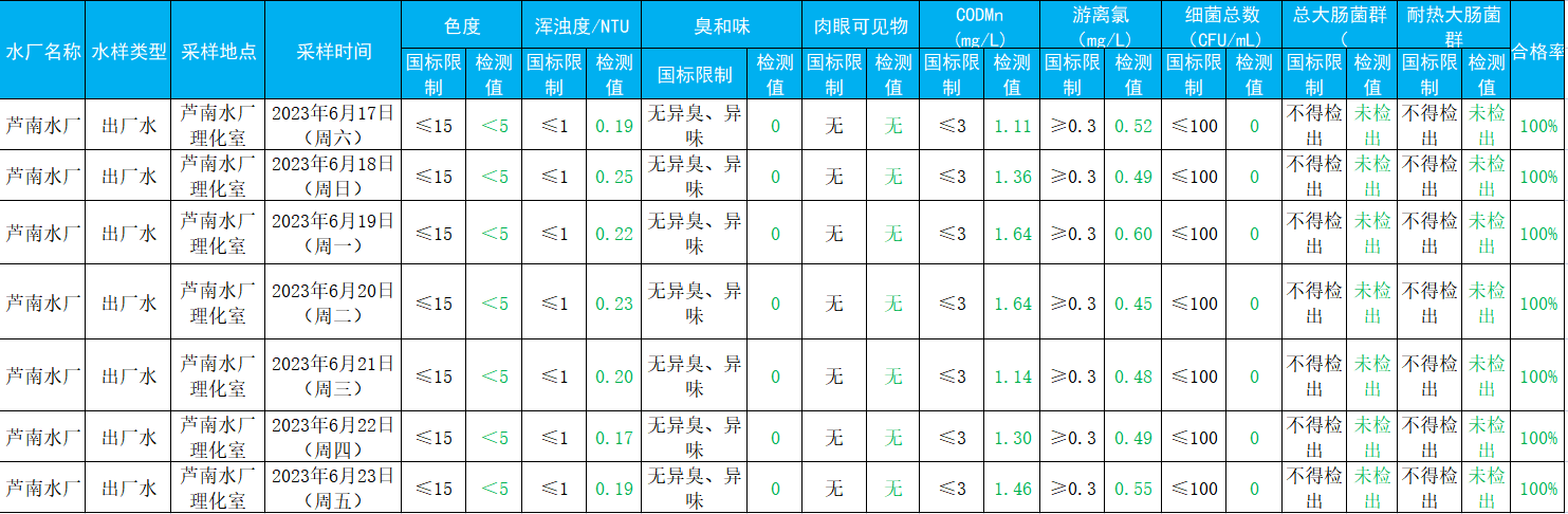 2023年6月17日——2023年6月23日出厂水水质检测结果