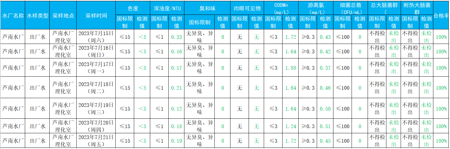2023年7月15日——2023年7月21日出厂水水质检测结果