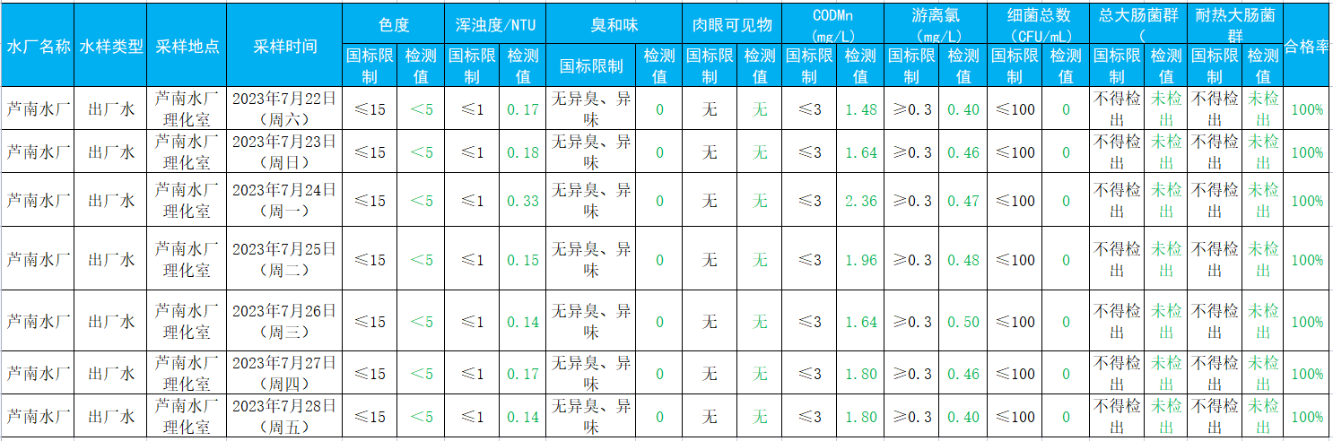 2023年7月22日——2023年7月28日出厂水水质检测结果