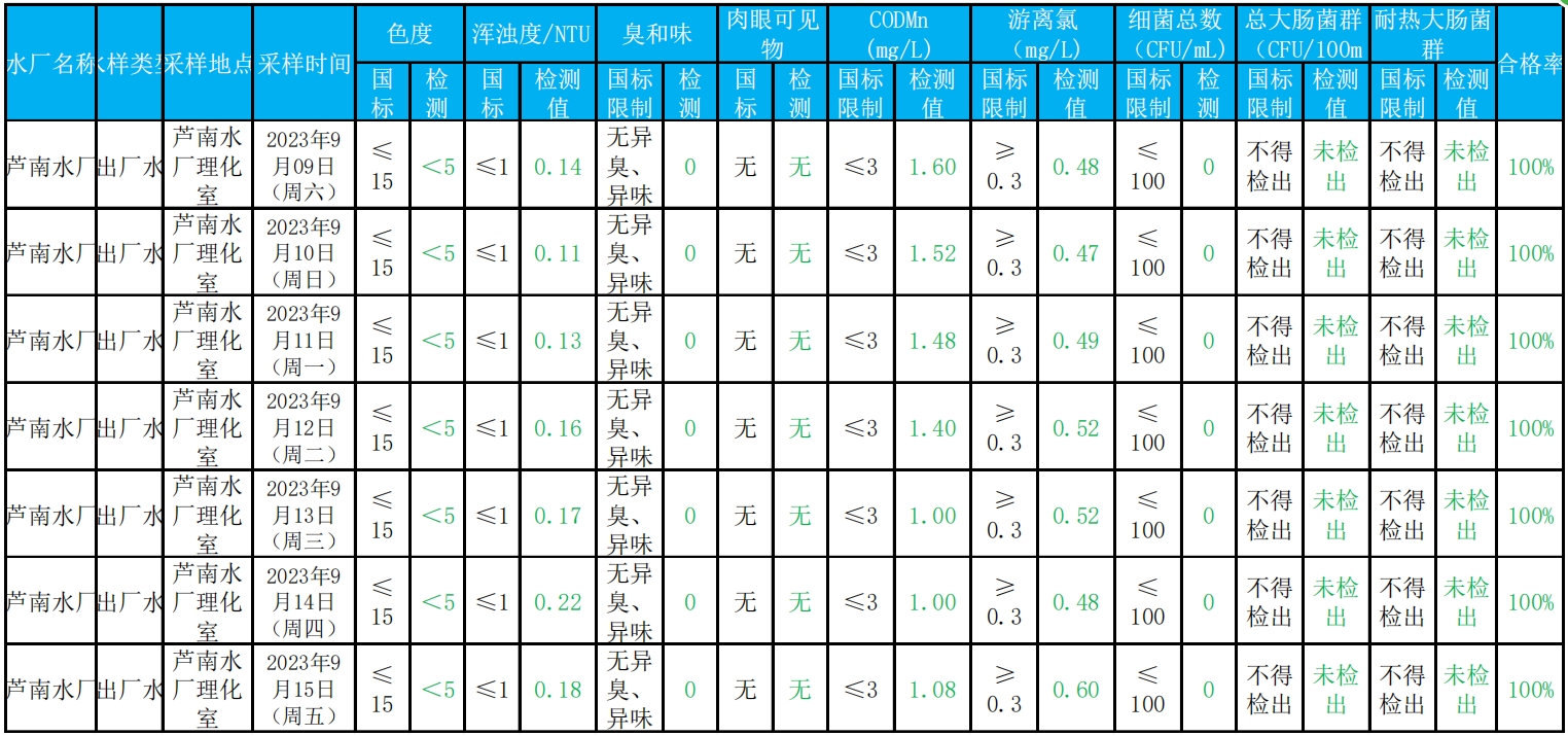 2023年9月9日——2023年9月15日出厂水水质检测结果