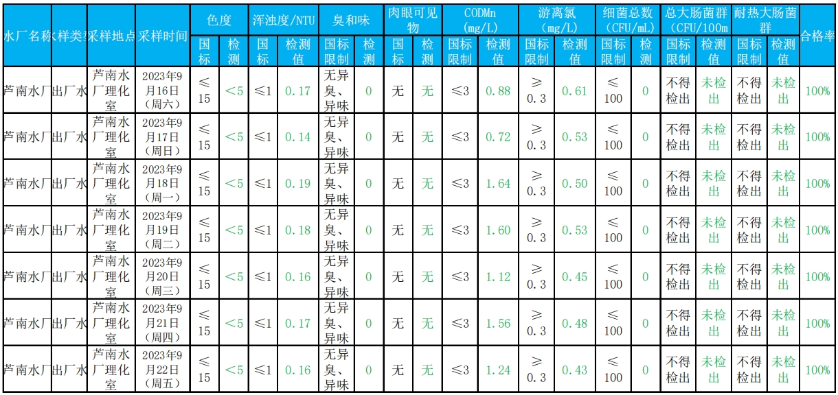 2023年9月16日——2023年9月22日出厂水水质检测结果