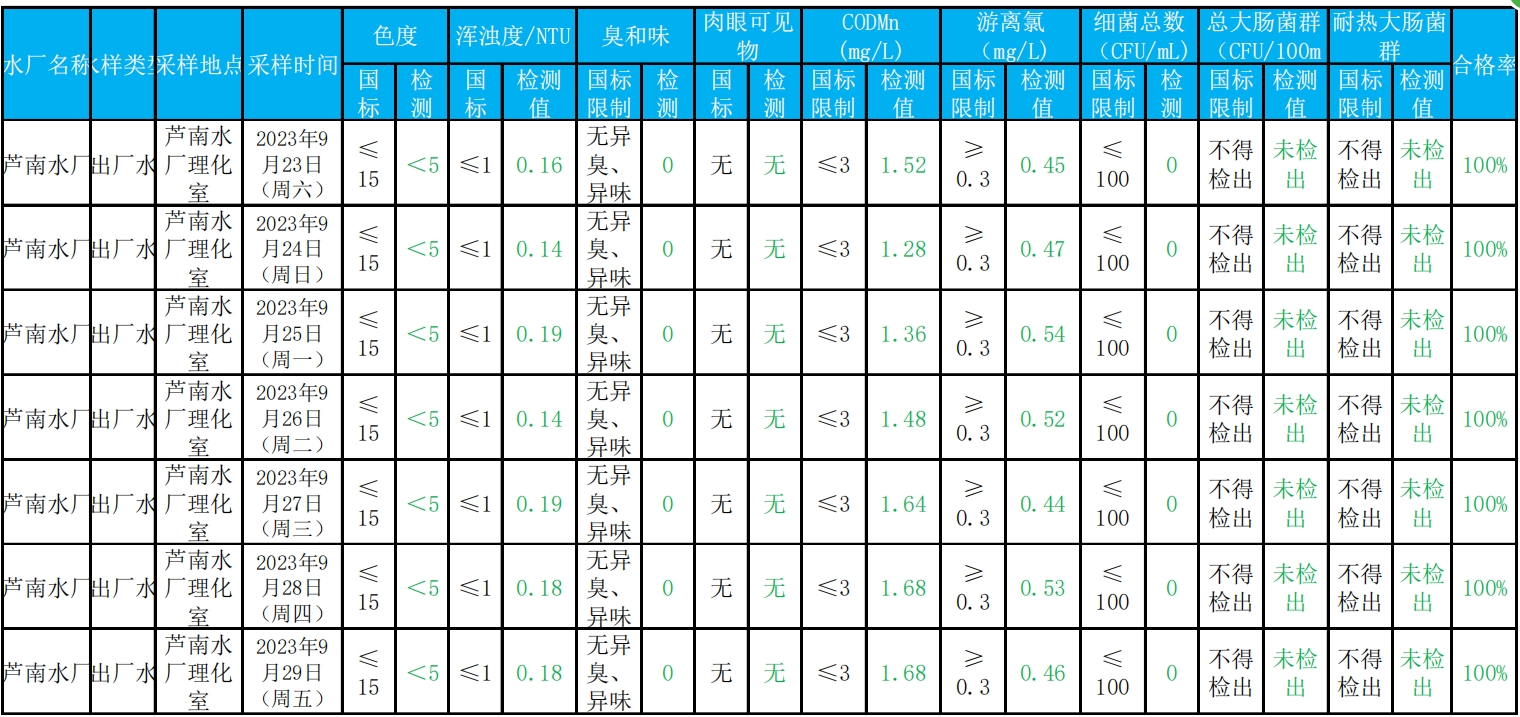 2023年9月23日——2023年9月29日出厂水水质检测结果