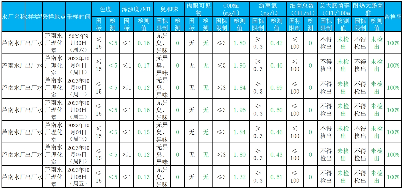 2023年9月30日——2023年10月6日出厂水水质检测结果