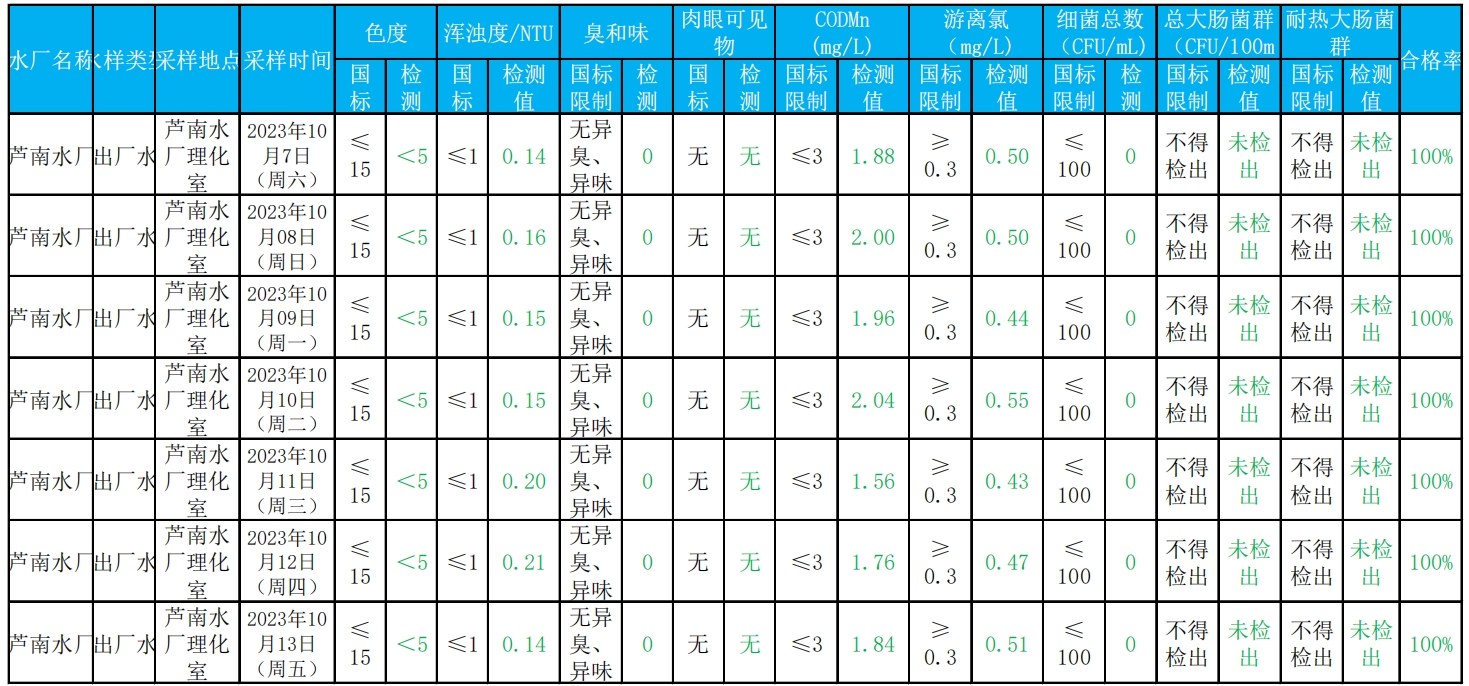 2023年10月7日——2023年10月13日出厂水水质检测结果