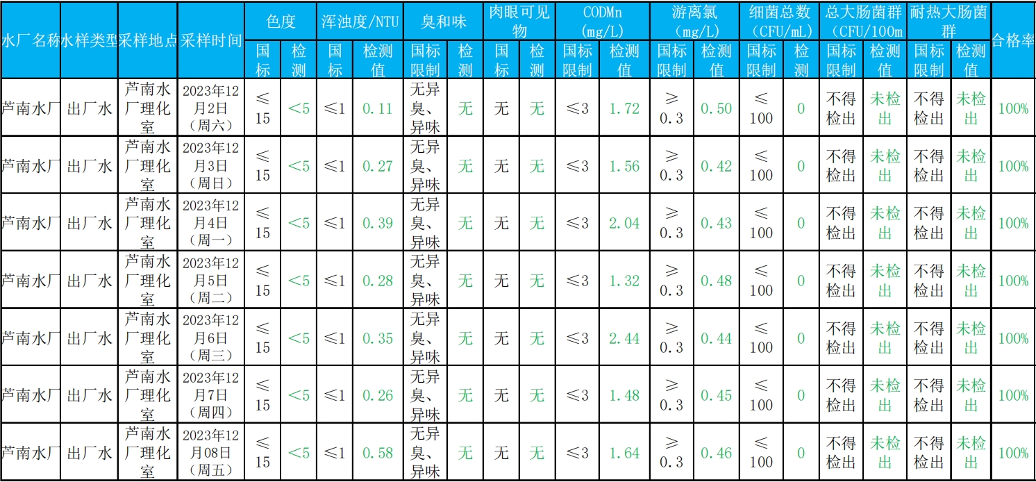 2023年12月2日——2023年12月8日出厂水水质检测结果