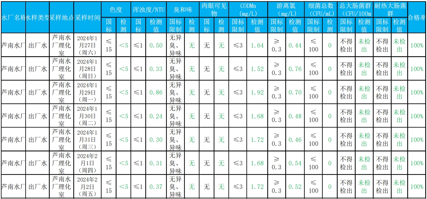 2024年1月27日——2024年2月2日出厂水水质检测结果
