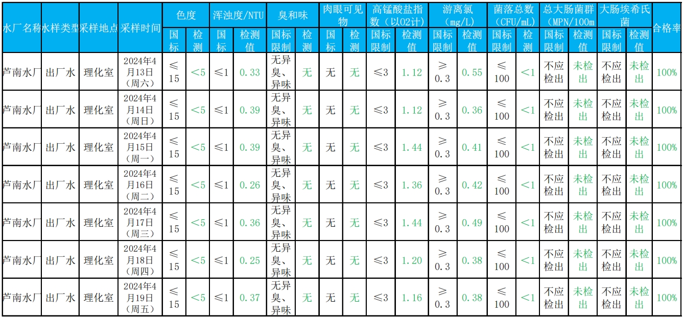 2024年4月13日——2024年4月19日出厂水水质检测结果
