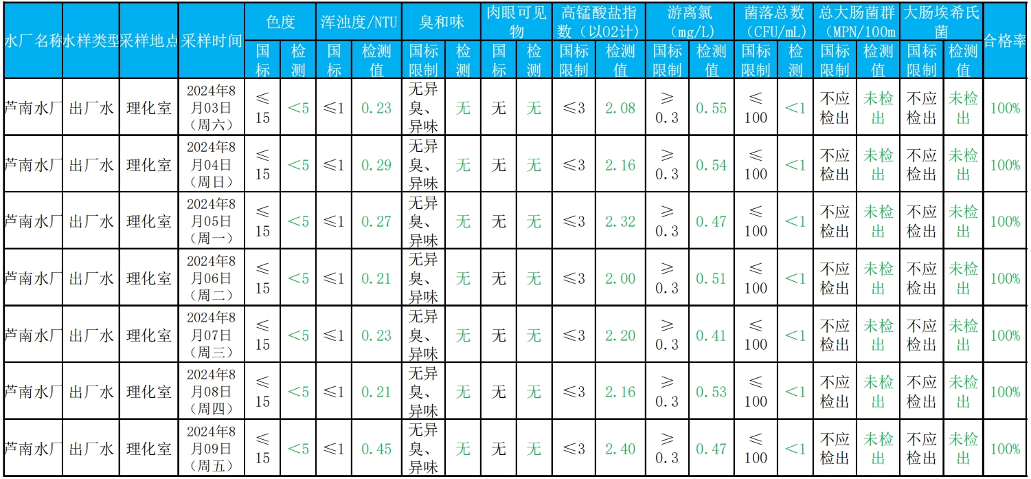 2024年8月3日——2024年8月9日出厂水水质检测结果