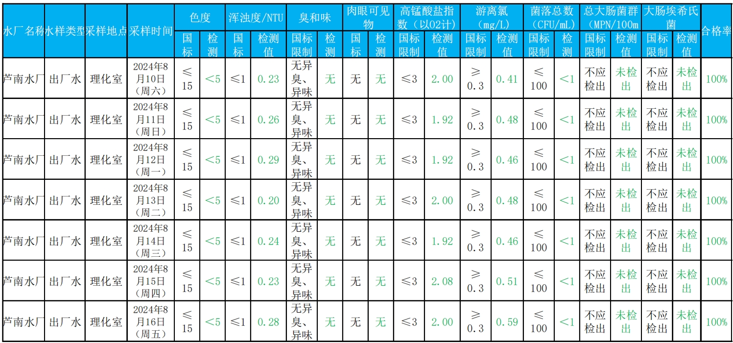 2024年8月10日——2024年8月16日出厂水水质检测结果