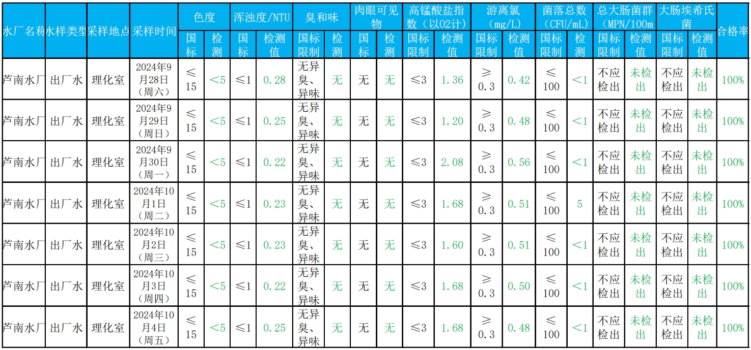 2024年9月28日——2024年10月4日出厂水水质检测结果