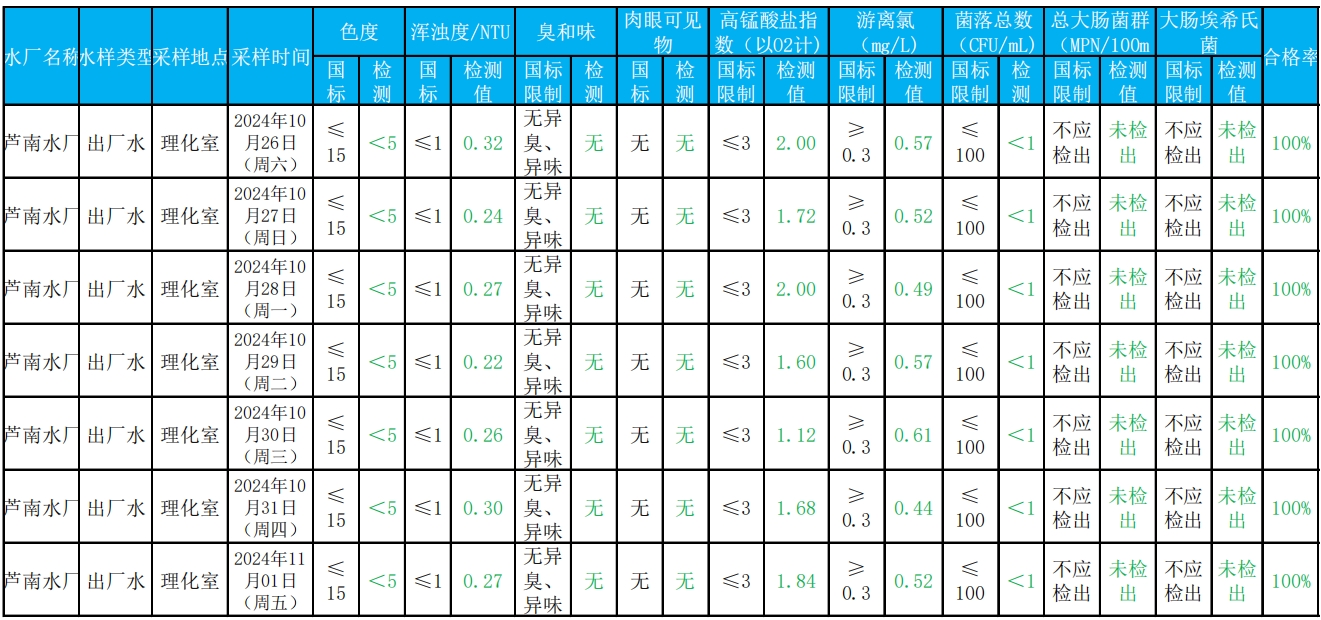2024年10月26日——2024年11月1日出厂水水质检测结果