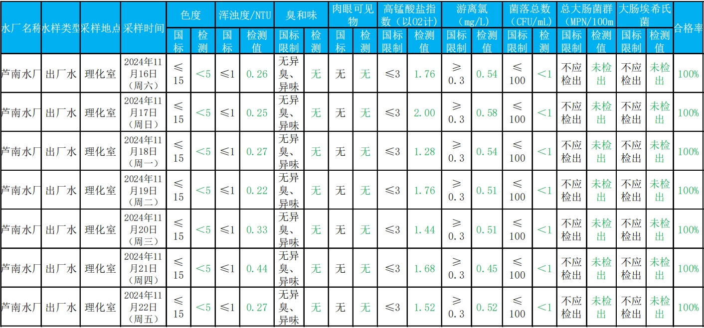 2024年11月16日——2024年11月22日出厂水水质检测结果