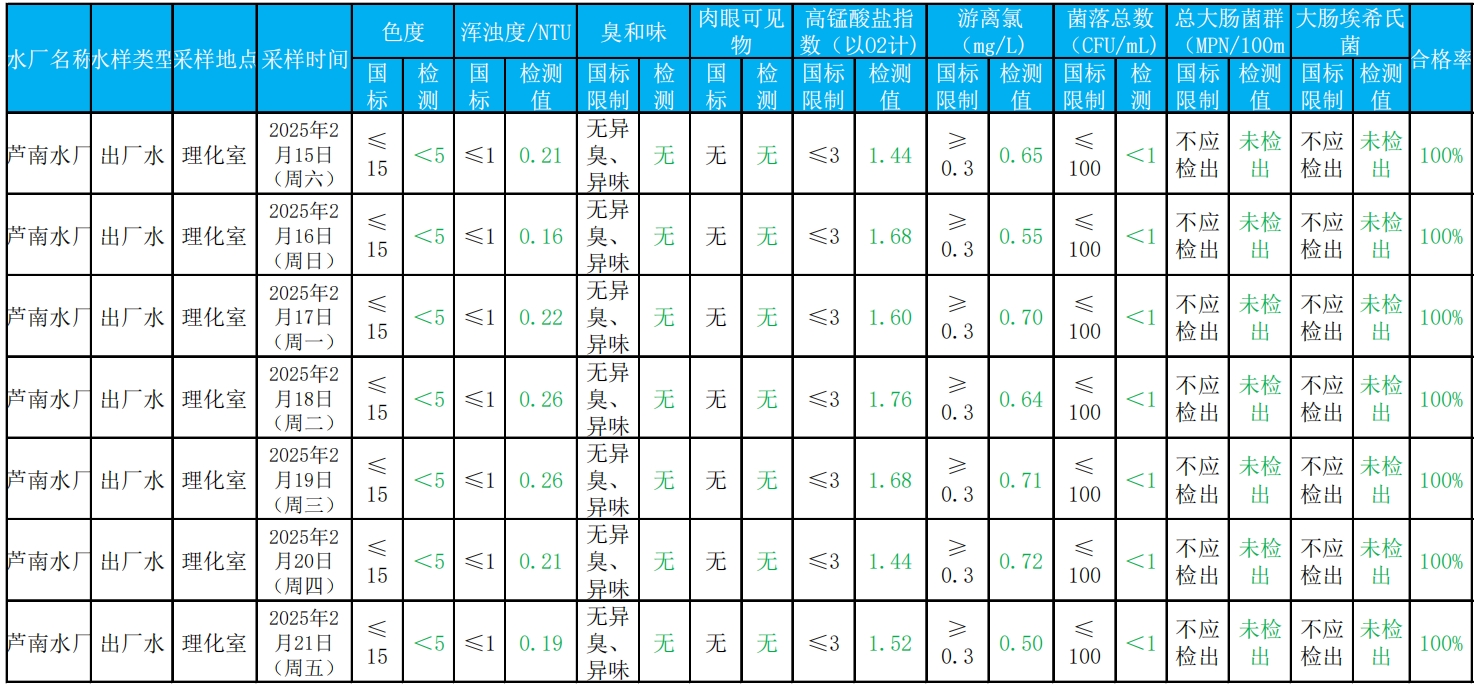 2025年2月15日——2025年2月21日出厂水水质检测结果