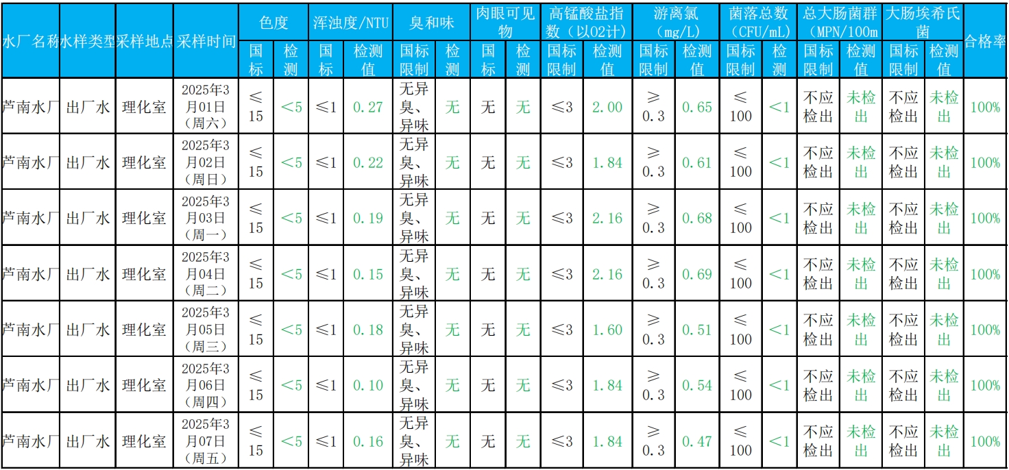 2025年3月1日——2025年3月7日出厂水水质检测结果