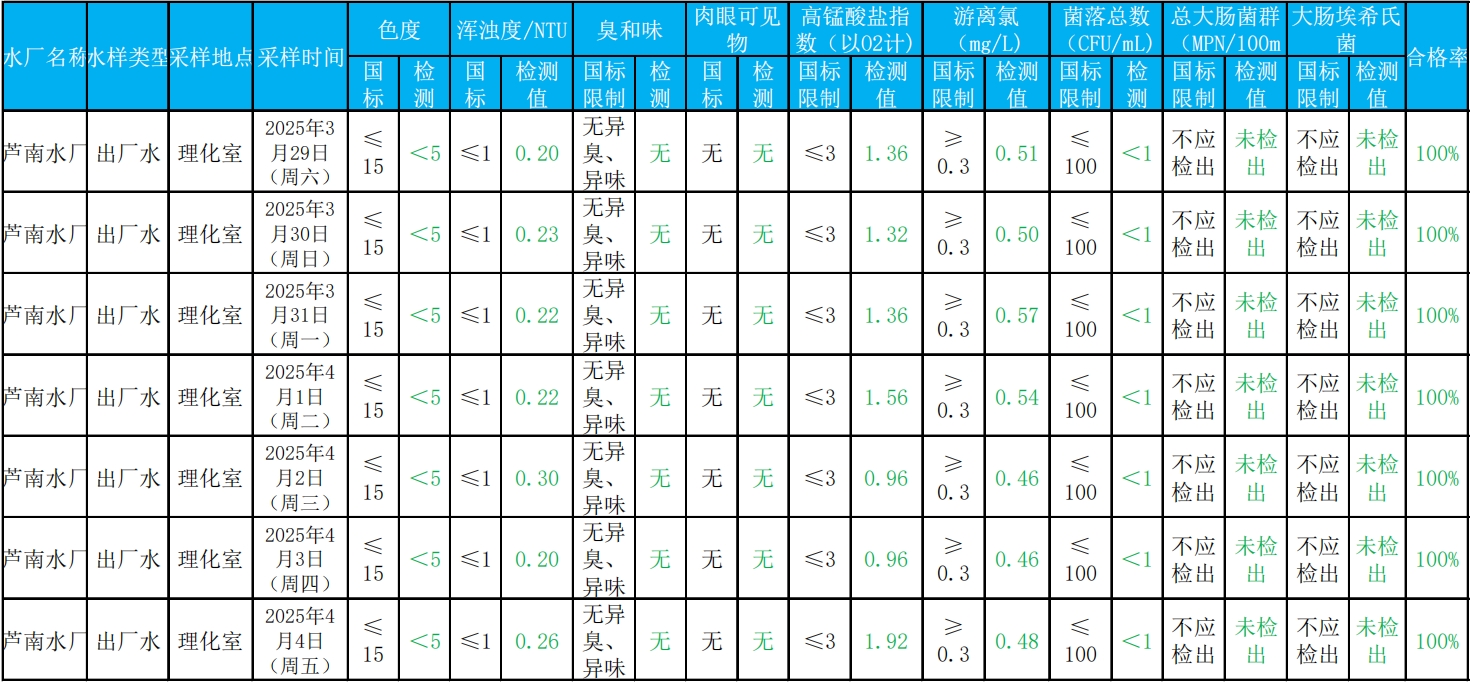 2025年3月29日——2025年4月4日出厂水水质检测结果